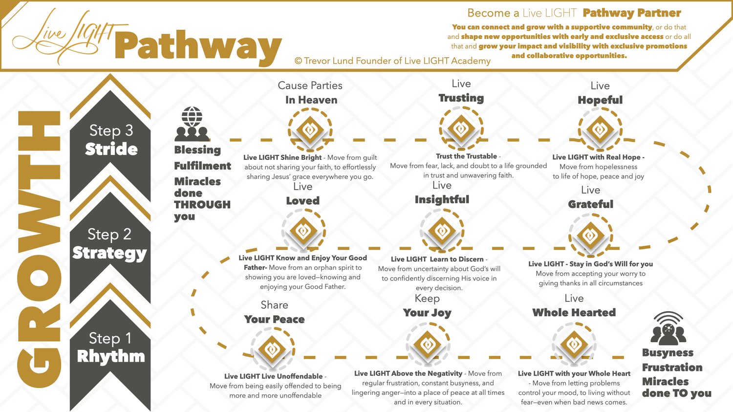 The Live LIGHT Pathway takes your through 3 Steps and 9 Movements to take you from busyness to blessing, frustration to fulfillment and from miracles done to you to miracles done through you.
